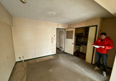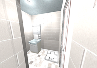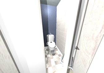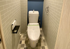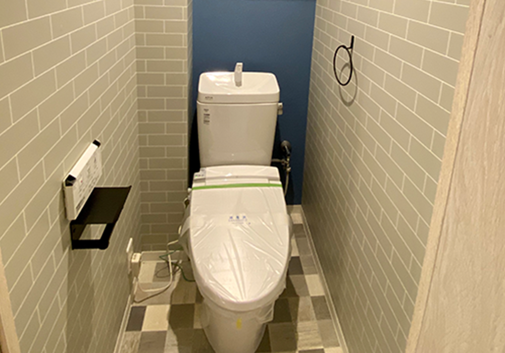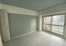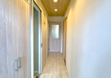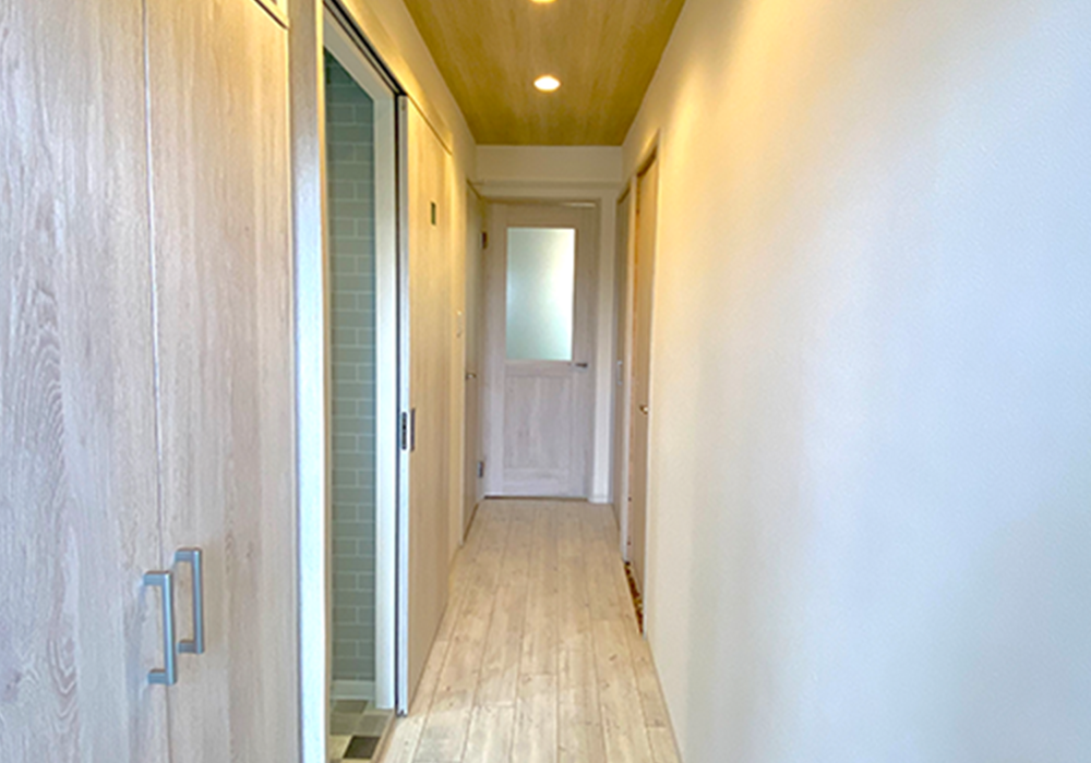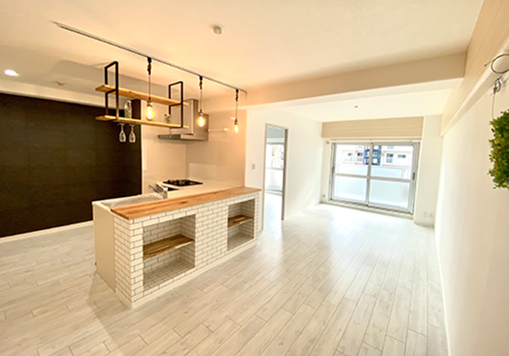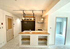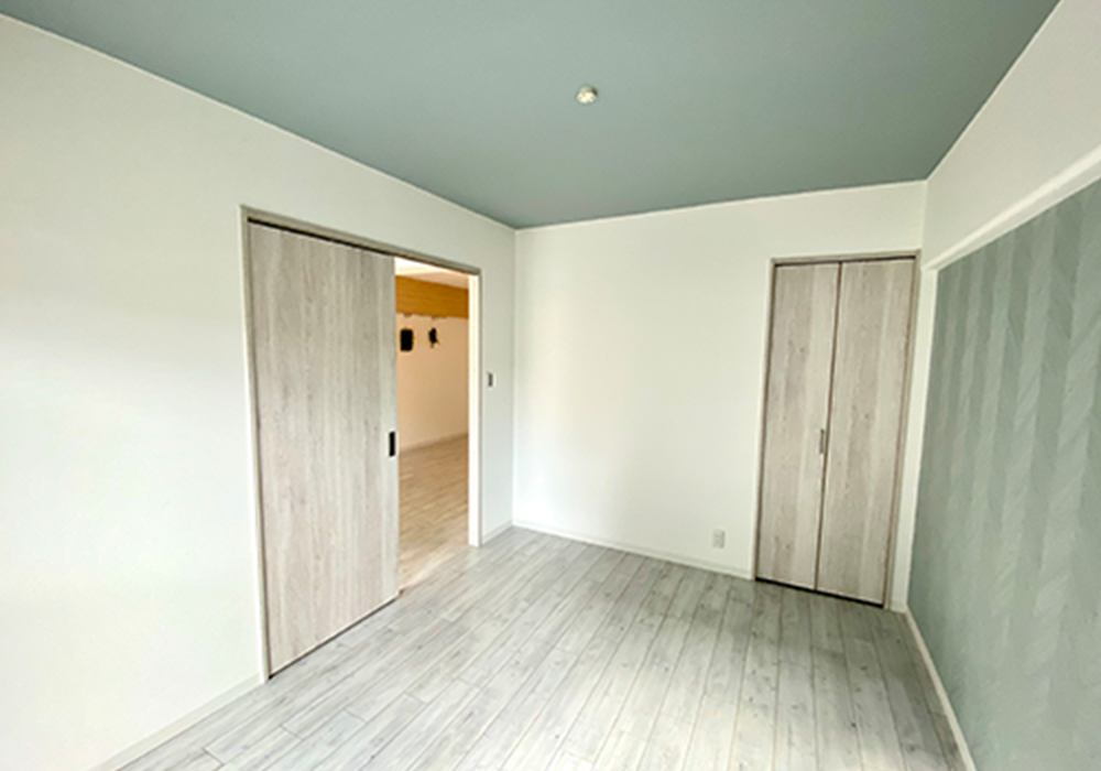 全体的に暗い雰囲気が漂っていたので明るく、太陽がまぶしく感じられるように心がけました。お部屋のテーマカラーはブルーグレーを用いました。カウンターの下にはお子さんが絵本を置けるニッチを造作