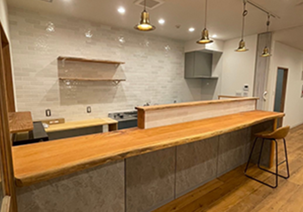 カウンターに天然の一枚板など随所で素材にこだわりました